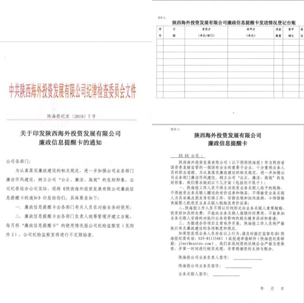 貫徹落實,廉潔意識入心。公司紀(jì)委結(jié)合再次征求的意見建議下發(fā)了《陜西海外投資發(fā)展有限公司關(guān)于廉政信息提醒卡的通知》(試行),公司各業(yè)務(wù)部門按要求進行對接,公司紀(jì)檢監(jiān)察室定期進行抽查。提醒卡公布了公司紀(jì)委監(jiān)督舉報電話,從而警醒公司業(yè)務(wù)人員及業(yè)務(wù)關(guān)聯(lián)人增強紀(jì)律和規(guī)矩意識,自覺做到廉潔奉公、規(guī)避風(fēng)險。
