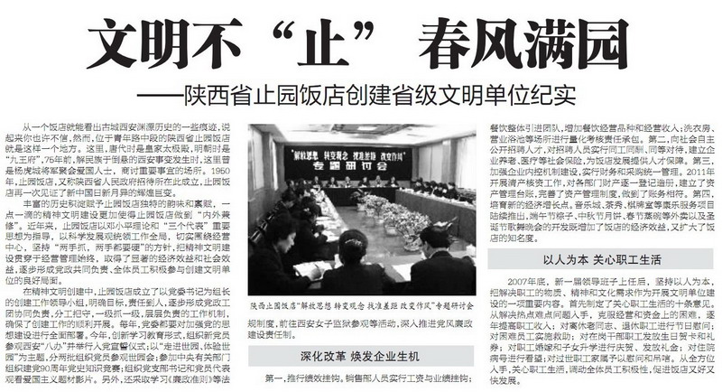 《西安日報》記者方斌峰在對止園飯店的采訪中,對飯店的創(chuàng)建省級文明單位活動進行了報道。2011年10月21日《西安日報》第四版刊登止園飯店創(chuàng)建省級文明單位的紀(jì)實。