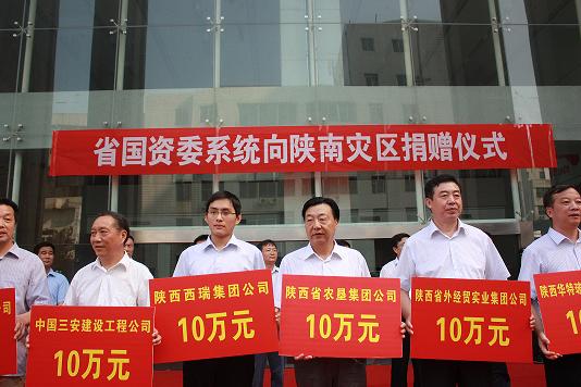 陜南災區(qū)群眾的情況深深的牽動著陜西省外經(jīng)貿實業(yè)集團全體員工的心,8月4日早上,省國資委系統(tǒng)國有企業(yè)向陜南災區(qū)捐款儀式在省國資委大樓前隆重舉行,副省長姚引良、省國資委黨委書記白阿瑩出席了儀式。陜西省外經(jīng)貿實業(yè)集團李鳳成副總經(jīng)理代表集團公司向陜南災區(qū)捐款10萬元,以實際行動支持陜南災后恢復重建和突破發(fā)展工作。