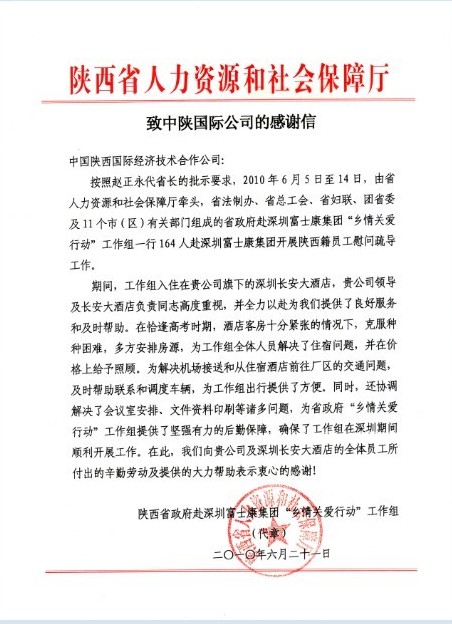 2010年6月5日至6月14日,陜西省有關(guān)部門組成的省政府赴深圳富士康“鄉(xiāng)情關(guān)愛行動”工作組一行164人在深圳富士康集團開展陜西籍員工慰問疏導工作,并入住我集團所屬深圳長安大酒店。在此期間,深圳長安大酒店的領(lǐng)導高度重視,和酒店全體員工全力以赴,克服困難,認真做好接待服務工作,為工作組在深圳的工作提供最優(yōu)質(zhì)服務和幫助,得到了工作組的高度贊揚。工作組回到西安后,特別致函我公司表示衷心感謝。