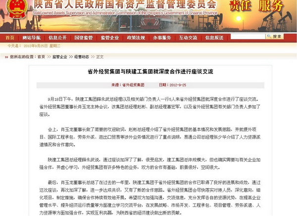 省國資委網(wǎng)站登載:省外經(jīng)貿(mào)集團(tuán)與陜建工集團(tuán)就深度合作進(jìn)行座談交流