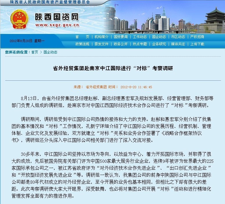 省國資委網(wǎng)站登載:省外經(jīng)貿(mào)集團赴南京中江國際進行“對標”考察調(diào)研