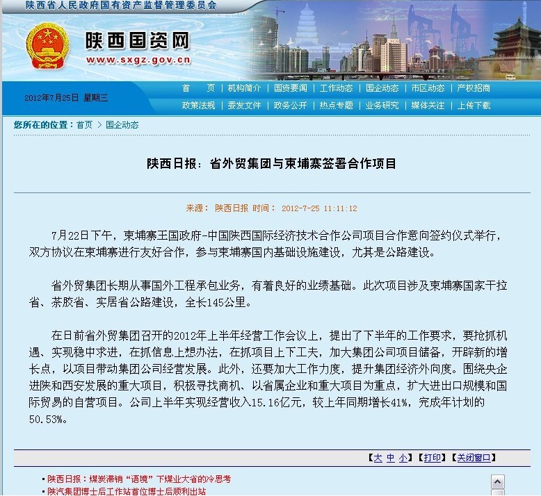省國資委網(wǎng)站登載:陜西日報刊登省外經(jīng)貿(mào)集團(tuán)與柬埔寨簽署合作項(xiàng)目