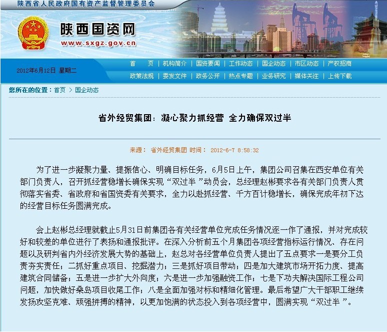省國資委網(wǎng)站登載:省外經(jīng)貿(mào)集團凝心聚力抓經(jīng)營 全力確保雙過半