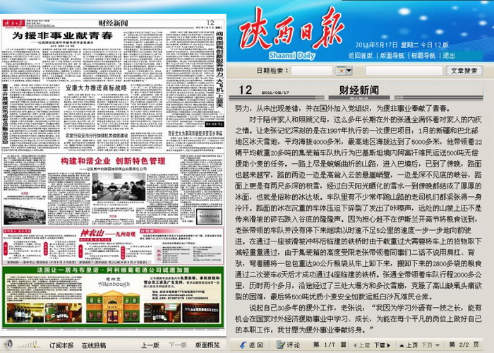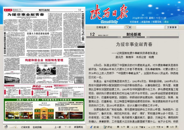 5月17日陜西日報財經(jīng)新聞頭條報道我集團退休職工張通全的援外事跡