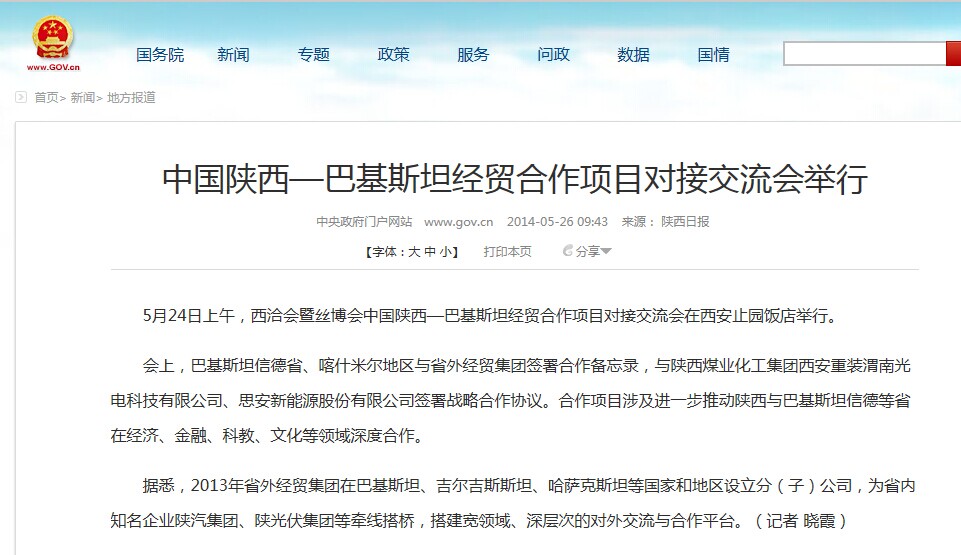 中央政府網(wǎng)站轉(zhuǎn)載集團(tuán)公司主辦《中國陜西—巴基斯坦經(jīng)貿(mào)合作項(xiàng)目對接交流會(huì)》情況