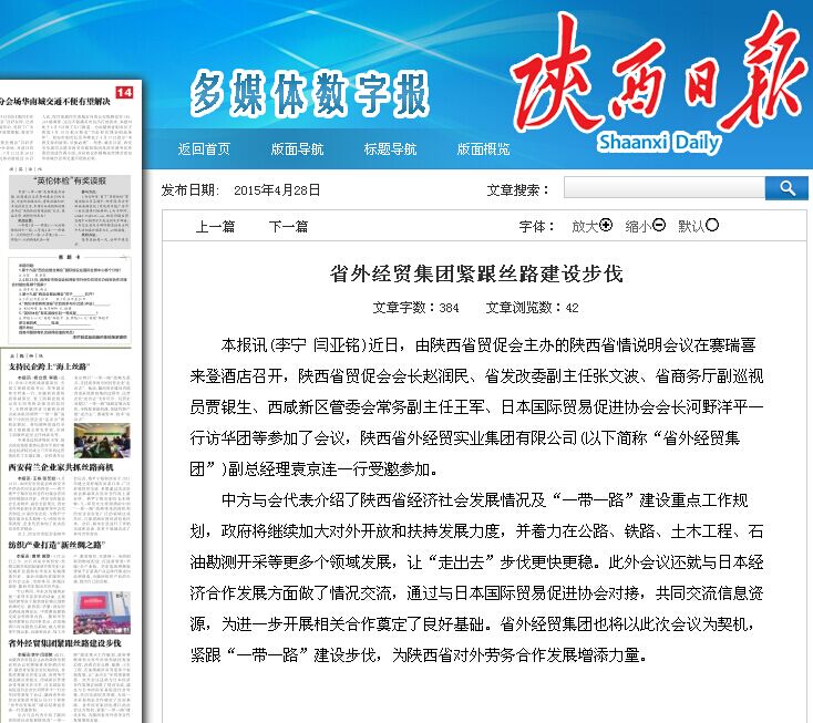 陜西日?qǐng)?bào)刊登---省外經(jīng)貿(mào)集團(tuán)緊跟絲路建設(shè)步伐