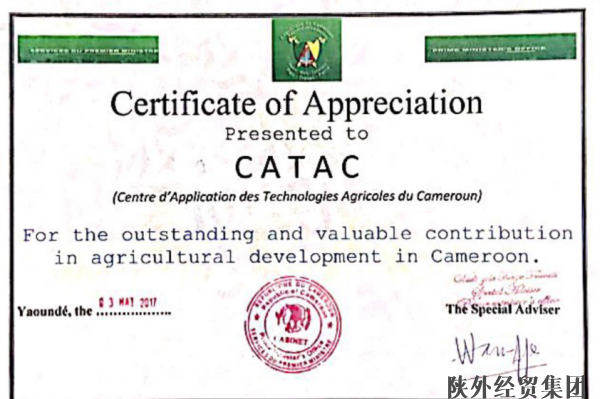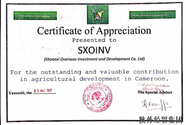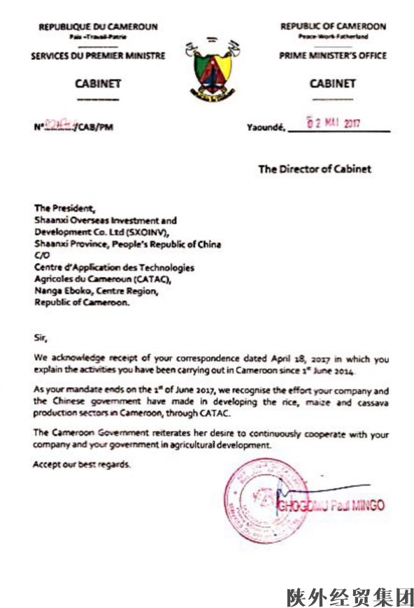 2017年5月3日上午,喀麥隆總理府對陜西海外投資發(fā)展有限公司和援喀麥隆農(nóng)業(yè)技術(shù)示范中心進(jìn)行了表彰。總理秘書寧先生(Nying Divine Shey)向陜西海外投資發(fā)展有限公司、援喀麥隆農(nóng)業(yè)技術(shù)示范中心代表李高超頒發(fā)杰出貢獻(xiàn)獎(jiǎng),并帶來了喀麥隆總理府辦公廳主任保羅?明歌代表喀麥隆總理菲勒蒙?揚(yáng)先生發(fā)來的感謝信。