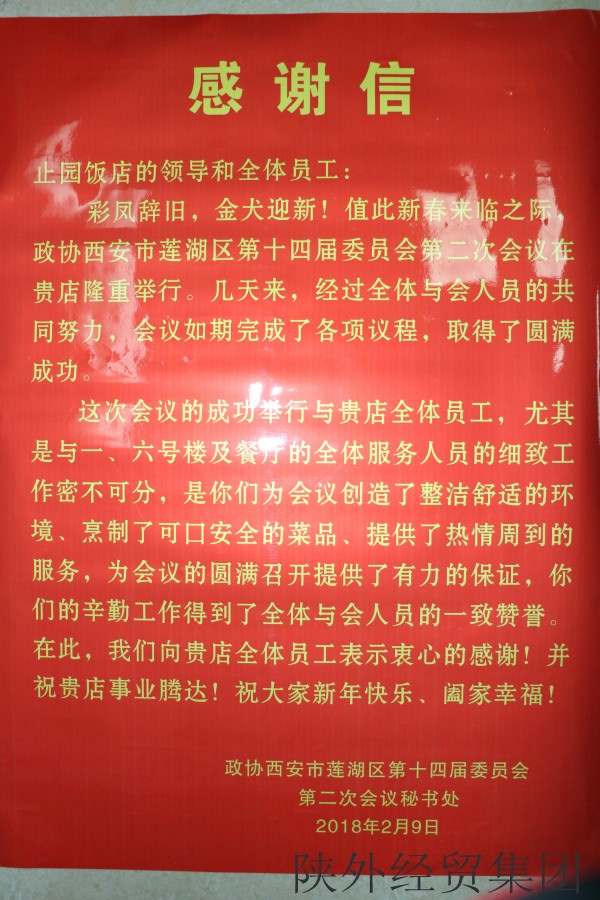 2月10日,西安市蓮湖區(qū) “兩會(huì)”在止園飯店順利閉幕?!皟蓵?huì)”期間,止園飯店公司全體員工認(rèn)真圍繞飯店接待方案,恪盡職守,勇于奉獻(xiàn),扎實(shí)開展各項(xiàng)服務(wù)工作,受到與會(huì)代表一致好評(píng)。