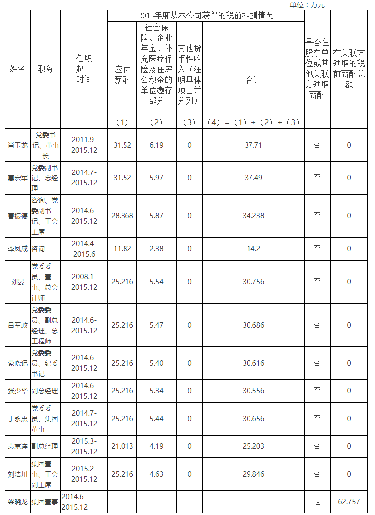 1.上表披露薪酬為我公司負(fù)責(zé)人2015年度全部應(yīng)發(fā)稅前薪酬,按國(guó)家規(guī)定由單位繳存各種社會(huì)保險(xiǎn)等。其中,第(1)項(xiàng)由國(guó)資委(薪酬審核部門(mén))核定。